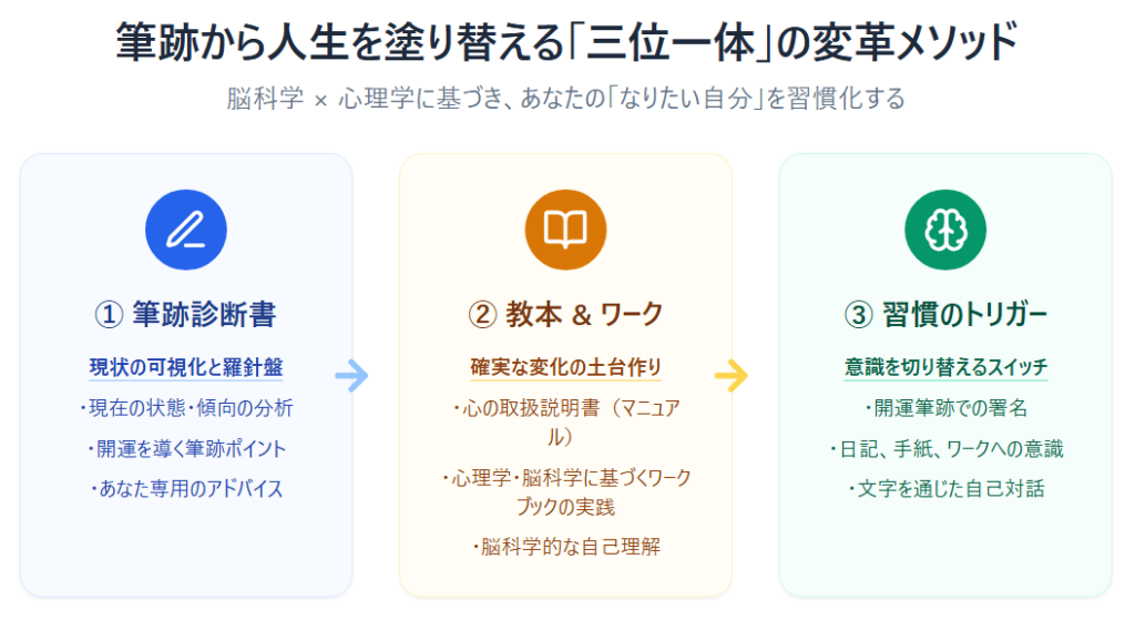 そのことを踏まえ、私共が提供する筆跡診断では、開運筆跡の練習を、「単なる文字を書く練習」ではなく、ご自身が望むあり方や、大切にしたいことを意識するためのトリガー(きっかけ)として使っていただきたいと考えています。